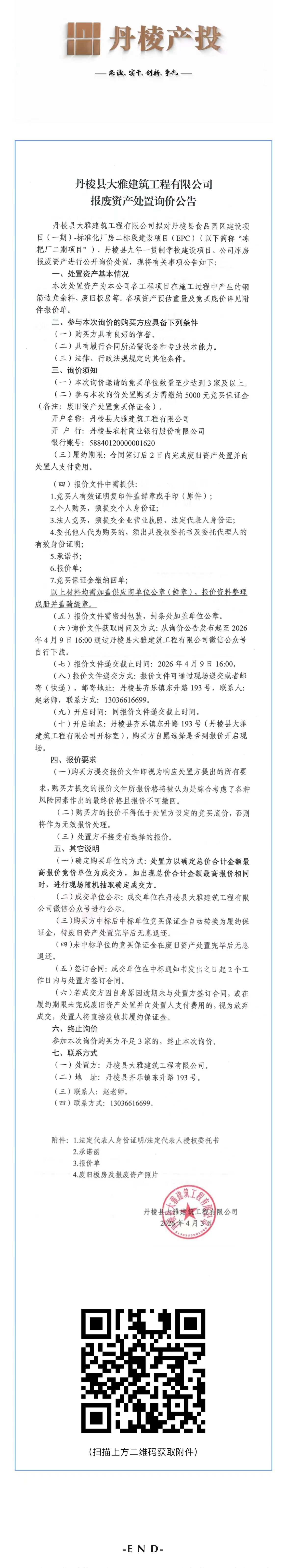 丹棱縣大雅建筑工程有限公司報(bào)廢資產(chǎn)處置詢價(jià)公告