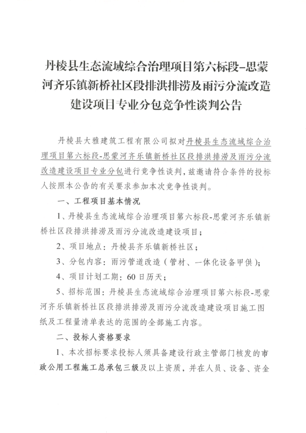 【大雅建筑公司】丹棱縣生態(tài)流域綜合治理項目第六標(biāo)段-思蒙河齊樂鎮(zhèn)新橋社區(qū)段排洪排澇及雨污分流改造建設(shè)項目專業(yè)分包競爭性談判公告