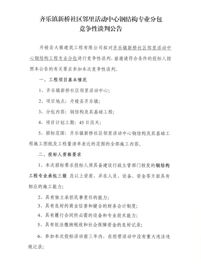 【大雅建筑公司】齊樂鎮(zhèn)新橋社區(qū)鄰里活動(dòng)中心鋼結(jié)構(gòu)專業(yè)分包競(jìng)爭(zhēng)性談判公告