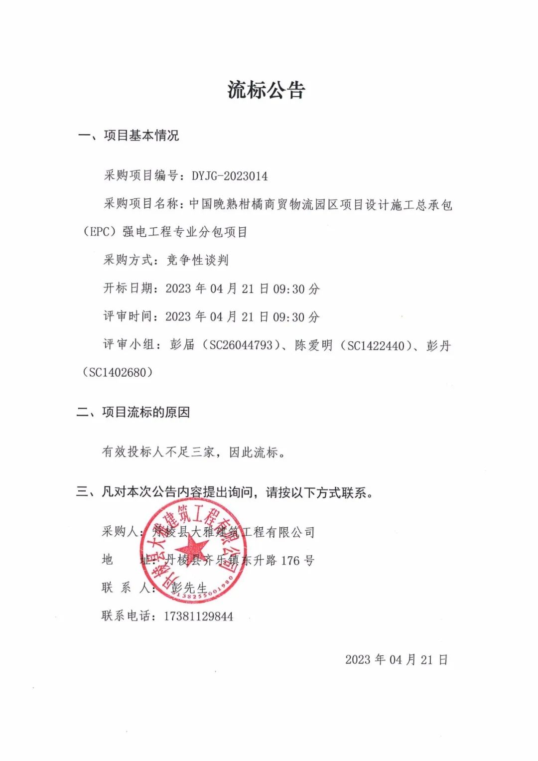 中國晚熟柑橘商貿(mào)物流園區(qū)項目設(shè)計施工總承包(EPC)強電工程專業(yè)分包項目流標(biāo)公告