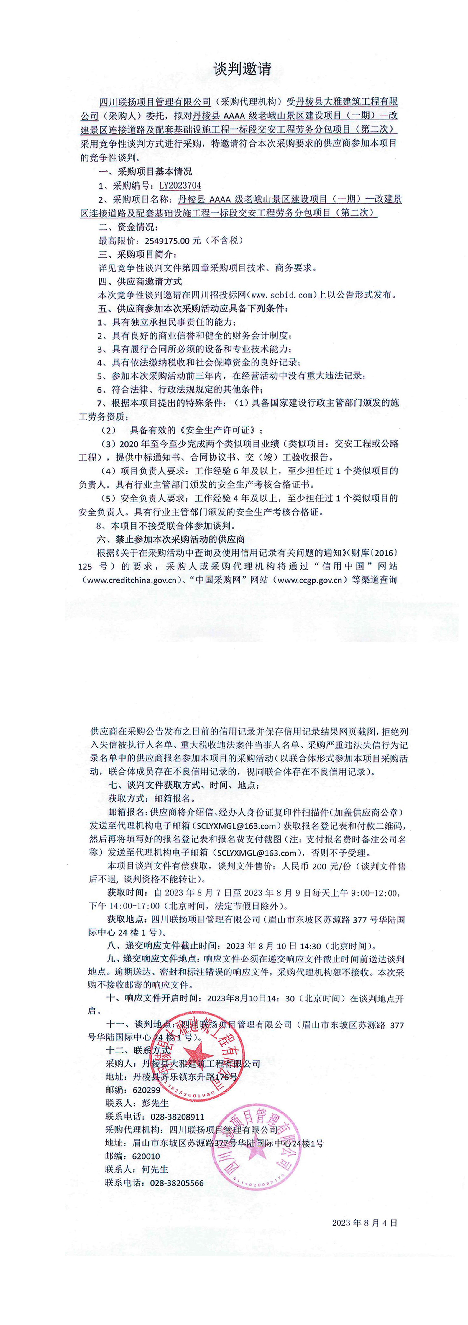 丹棱縣AAAA級(jí)老峨山景區(qū)建設(shè)項(xiàng)目(一期)一改建景區(qū)連接道路及配套基礎(chǔ)設(shè)施工程一標(biāo)段交安工程勞務(wù)分包項(xiàng)目(第二次)談判邀請(qǐng)