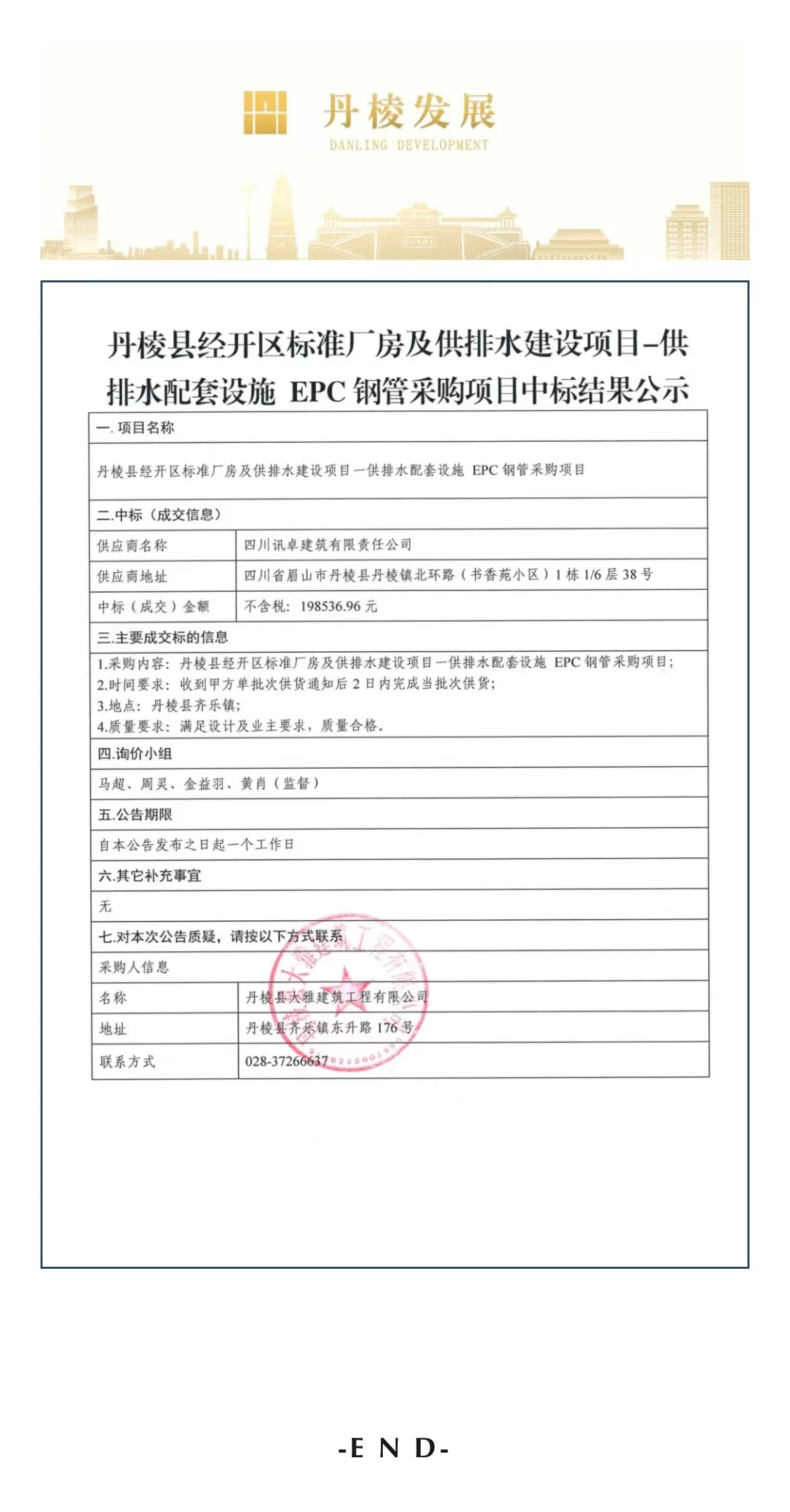 丹棱縣經(jīng)開區(qū)標(biāo)準(zhǔn)廠房及供排水建設(shè)項(xiàng)目——供排水配套設(shè)施EPC鋼管采購項(xiàng)目中標(biāo)結(jié)果公示