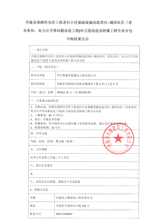【大雅建筑公司】丹棱縣保障性安居工程老舊小區(qū)基礎(chǔ)設(shè)施改造項(xiàng)目--城西社區(qū)(老水務(wù)局、電力公司等風(fēng)貌改造工程)外立面改造及附屬工程專業(yè)分包中標(biāo)結(jié)果公示