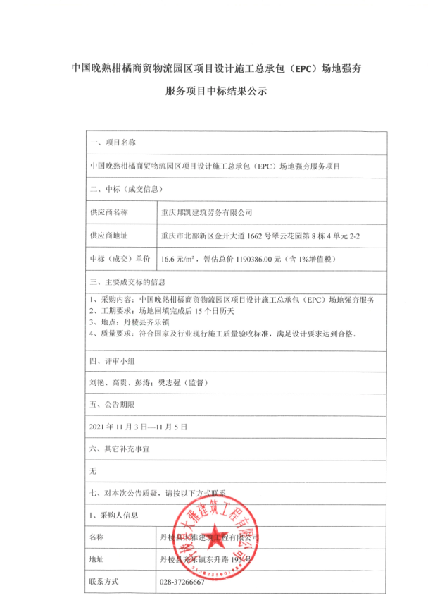 【大雅建筑公司】中國晚熟柑橘商貿(mào)物流園區(qū)項目設(shè)計施工總承包(EPC)場地強(qiáng)夯服務(wù)項目中標(biāo)結(jié)果公示