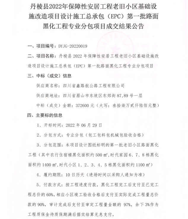 丹棱縣2022年保障性安居工程老舊小區(qū)基礎(chǔ)設(shè)施改造項(xiàng)目設(shè)計(jì)施工總承包(EPC)第一批路面黑化工程專(zhuān)業(yè)分包項(xiàng)目成交結(jié)果公告