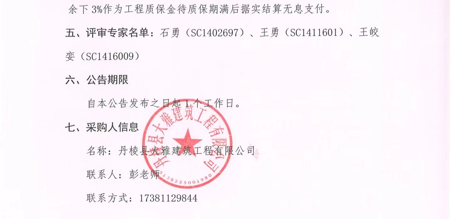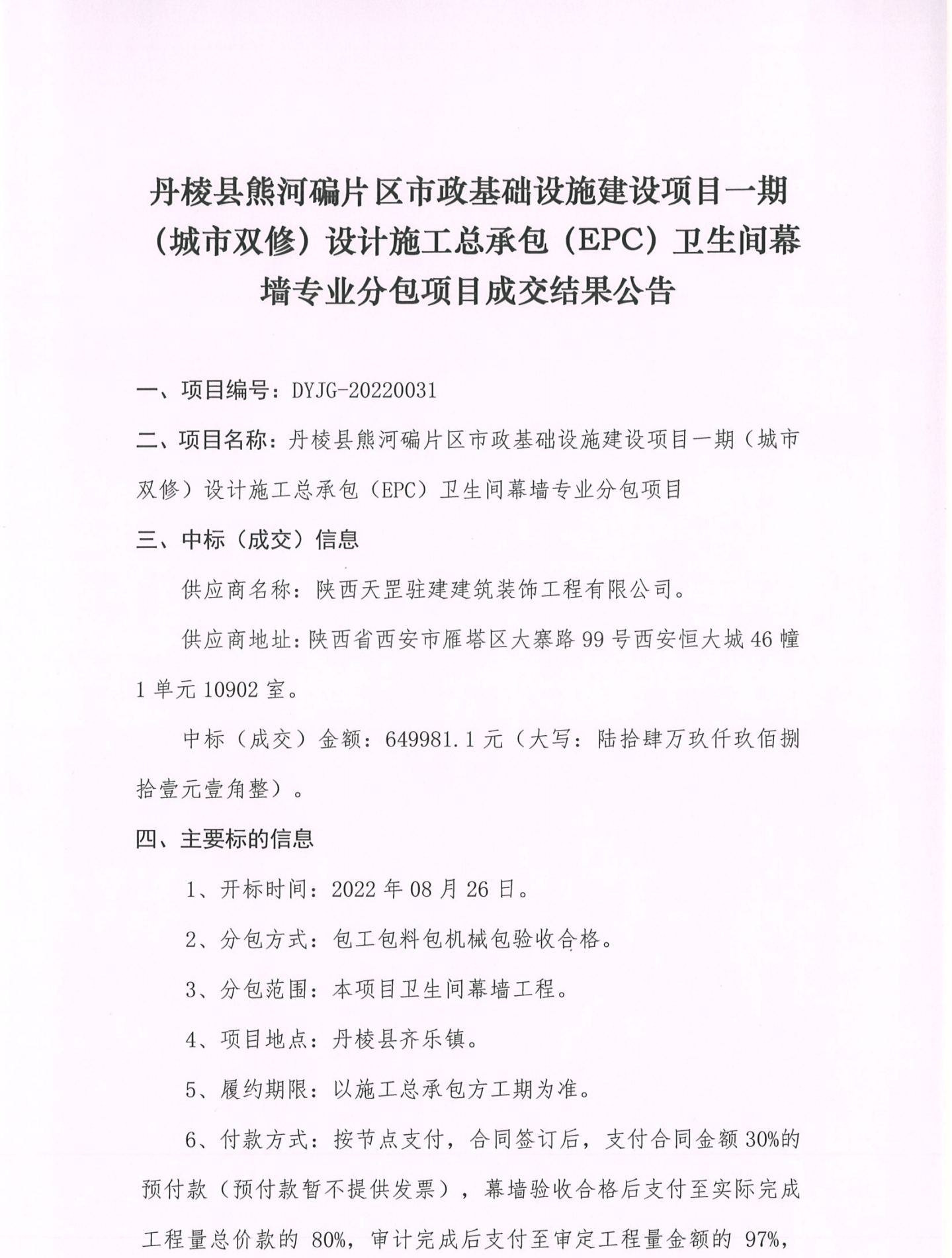 丹棱縣熊河碥片區(qū)市政基礎(chǔ)設(shè)施建設(shè)項目一期(城市雙修)設(shè)計施工總承包(EPC)衛(wèi)生間幕墻專業(yè)分包項目成交結(jié)果公告