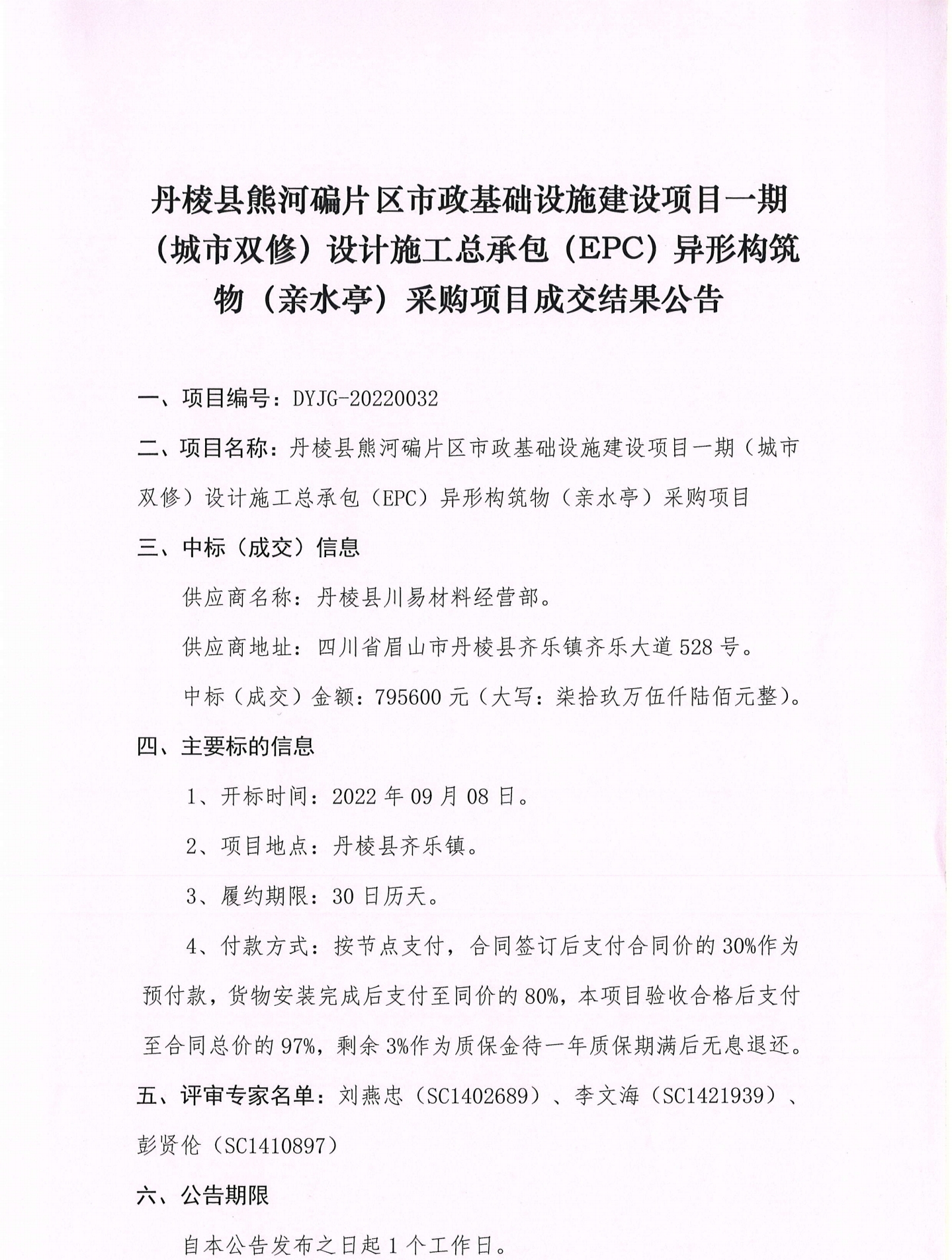 丹棱縣熊河碥片區(qū)市政基礎(chǔ)設(shè)施建設(shè)項(xiàng)目一期(城市雙修)設(shè)計(jì)施工總承包(EPC)異形構(gòu)筑物(親水亭)采購項(xiàng)目成交結(jié)果公告