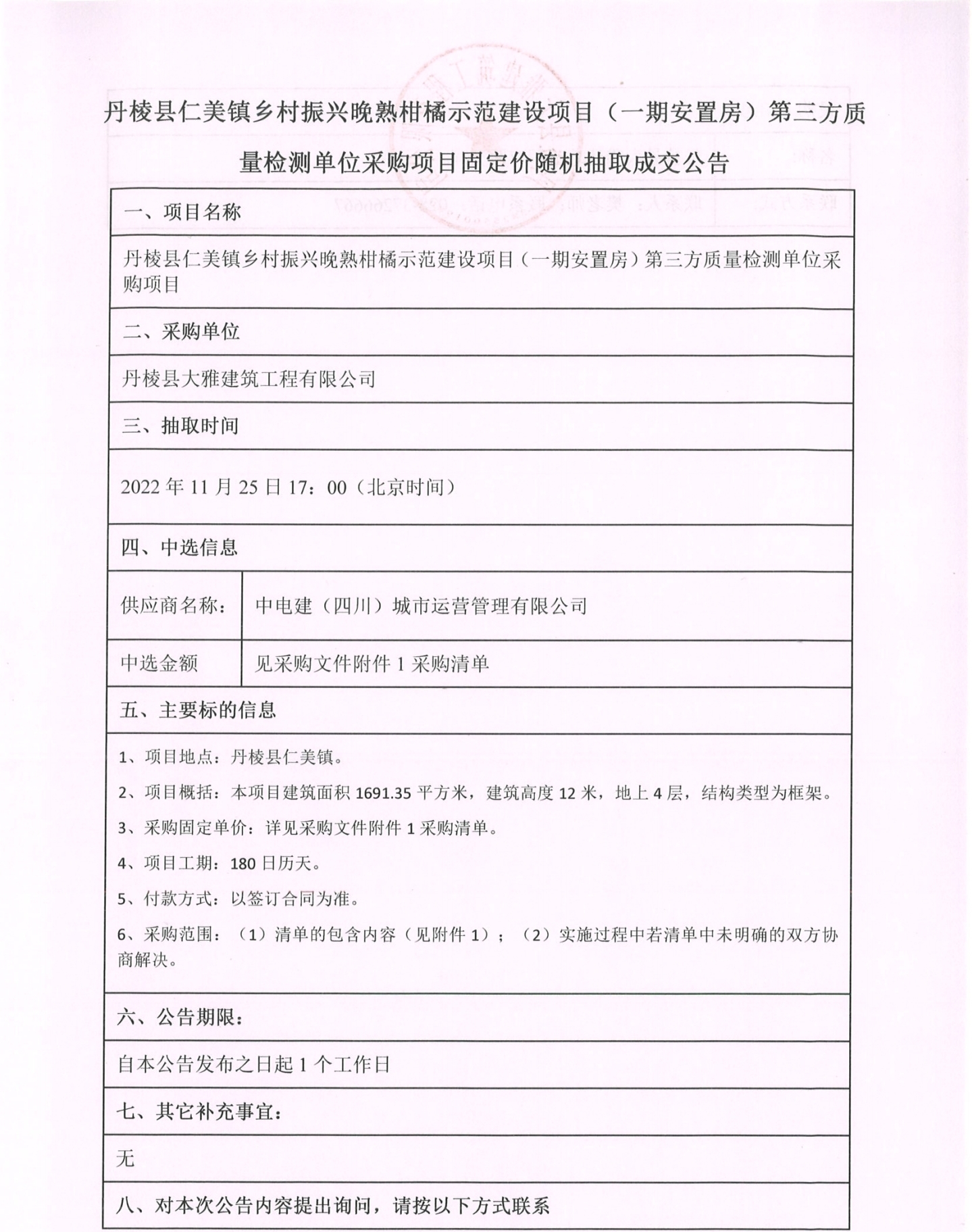 丹棱縣仁美鎮(zhèn)鄉(xiāng)村振興晚熟柑橘示范建設(shè)項目(一期安置房) 第三方質(zhì)量檢測單位采購項目固定價隨機抽取成交公告