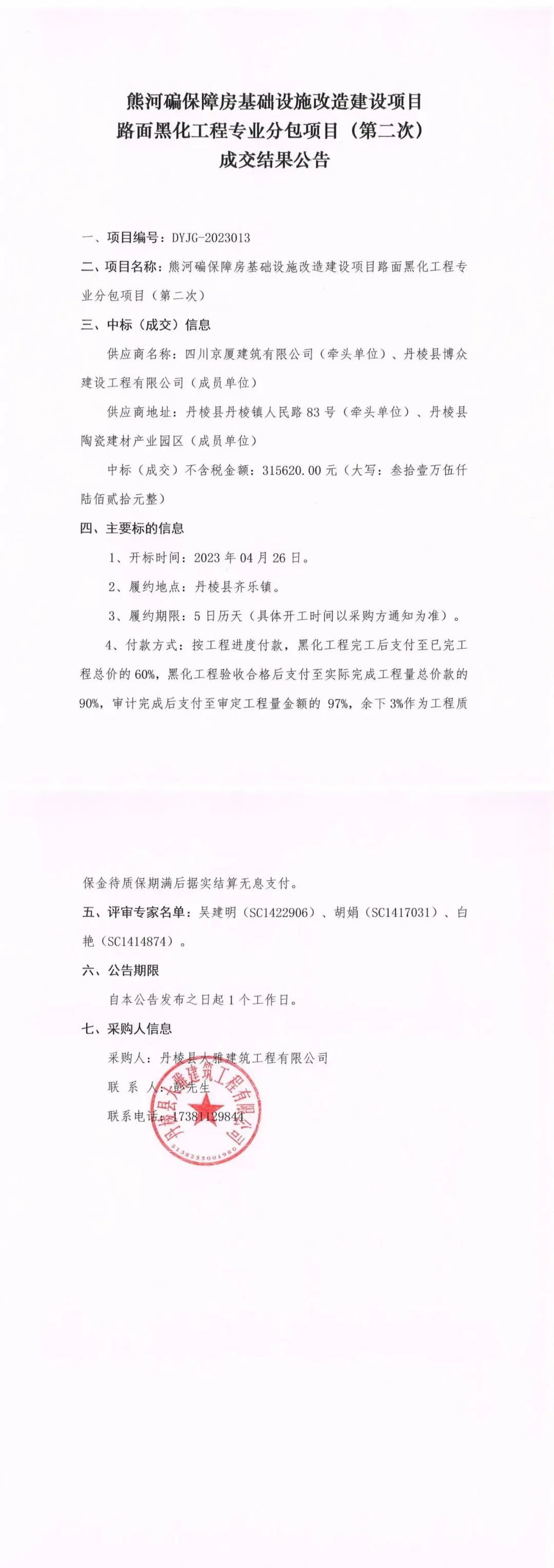 熊河碥保障房基礎(chǔ)設施改造建設項目路面黑化工程專業(yè)分包項目 (第二次)成交結(jié)果公告