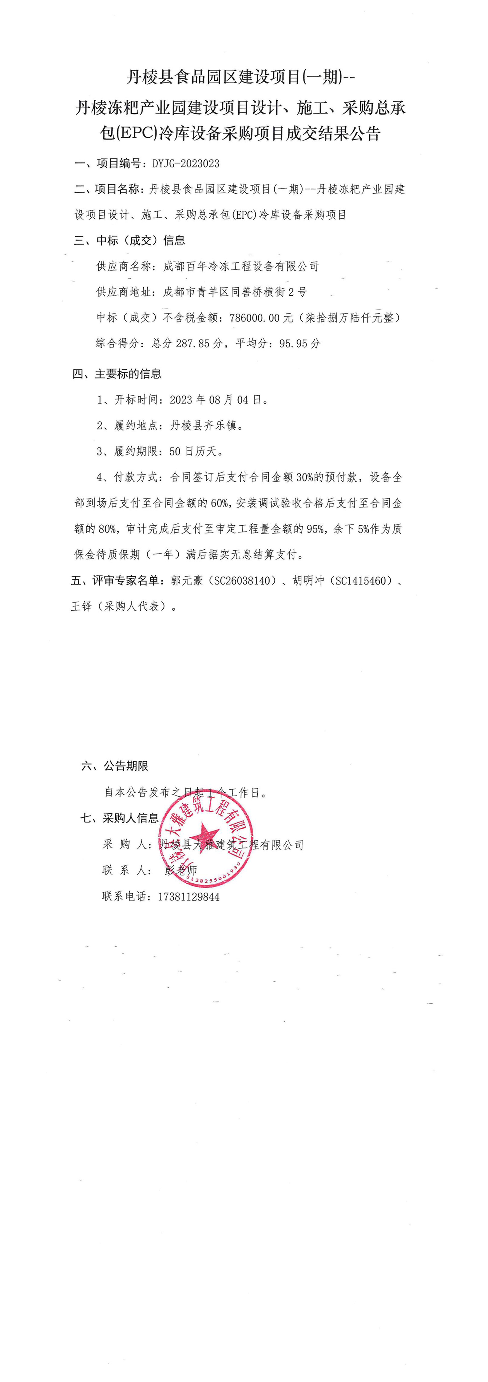 丹棱縣食品園區(qū)建設(shè)項(xiàng)目(一期)--丹棱凍粑產(chǎn)業(yè)園建設(shè)項(xiàng)目設(shè)計(jì)、施工、采購(gòu)總承包(EPC)冷庫(kù)設(shè)備采購(gòu)項(xiàng)目成交結(jié)果公告