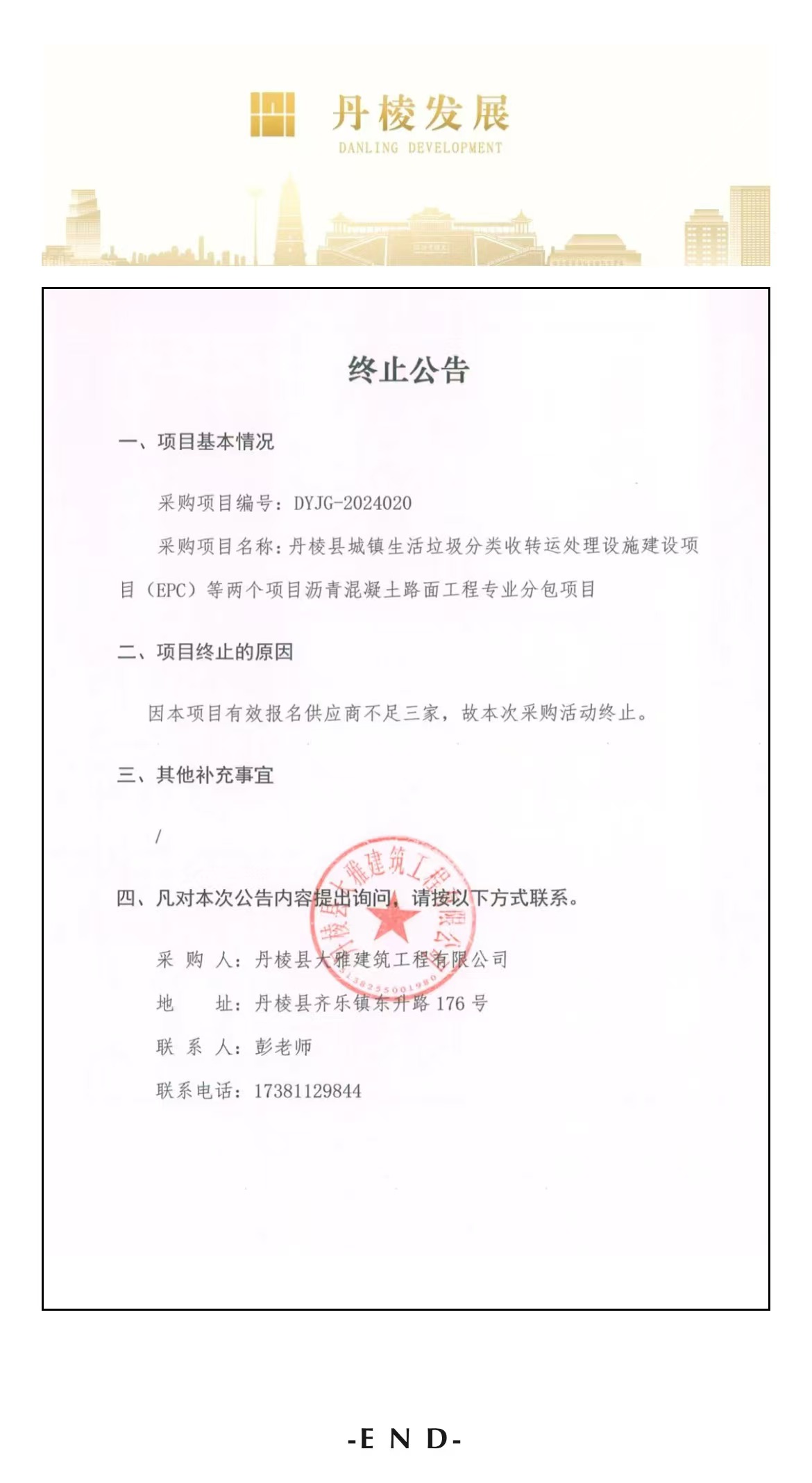 丹棱縣城鎮(zhèn)生活垃圾分類收轉(zhuǎn)運(yùn)處理設(shè)施建設(shè)項目(EPC)等兩個項目瀝青混凝土路面工程專業(yè)分包項目終止公告