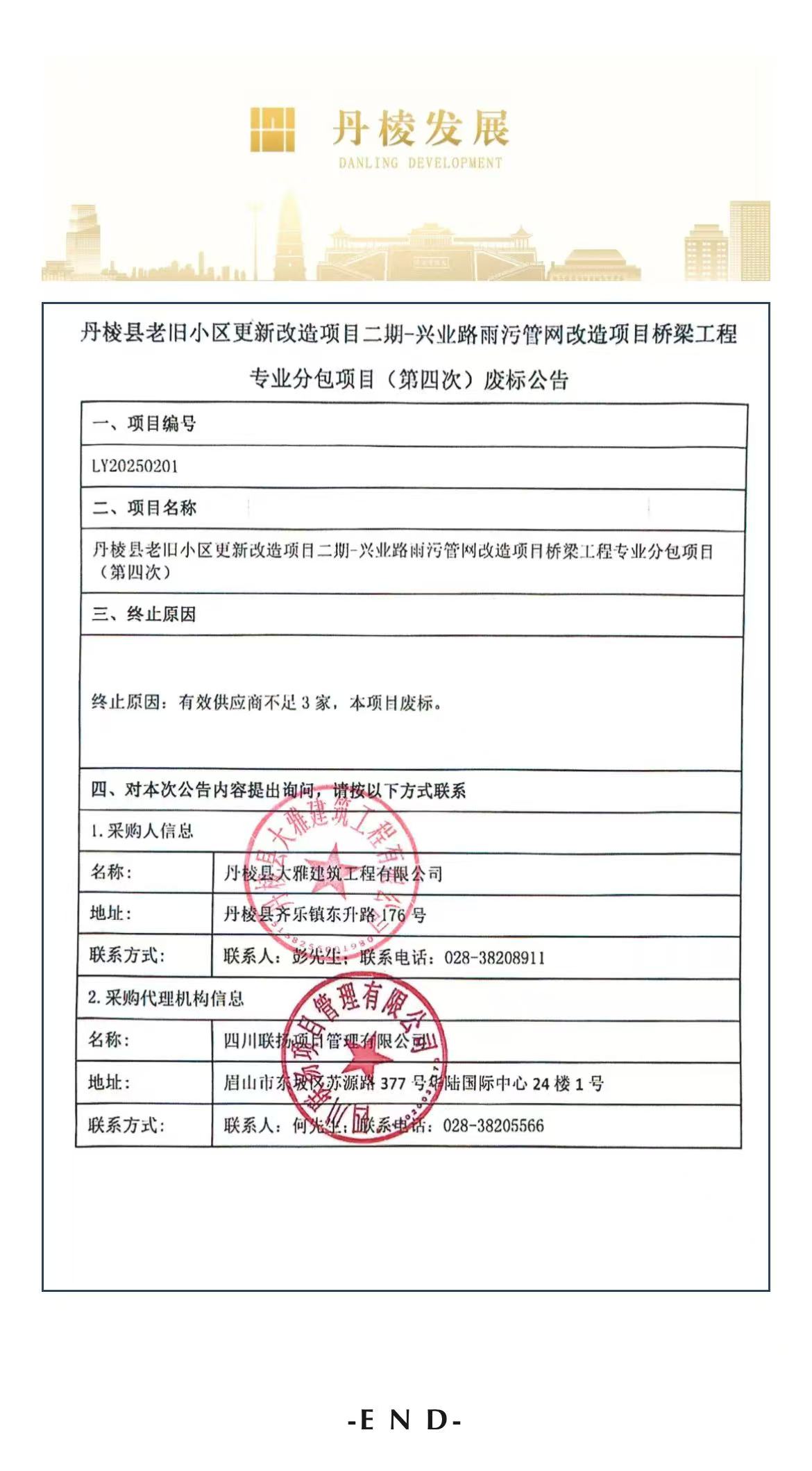 丹棱縣老舊小區(qū)更新改造項(xiàng)目二期-興業(yè)路雨污管網(wǎng)改造項(xiàng)目橋梁工程專(zhuān)業(yè)分包項(xiàng)目(第四次)廢標(biāo)公告