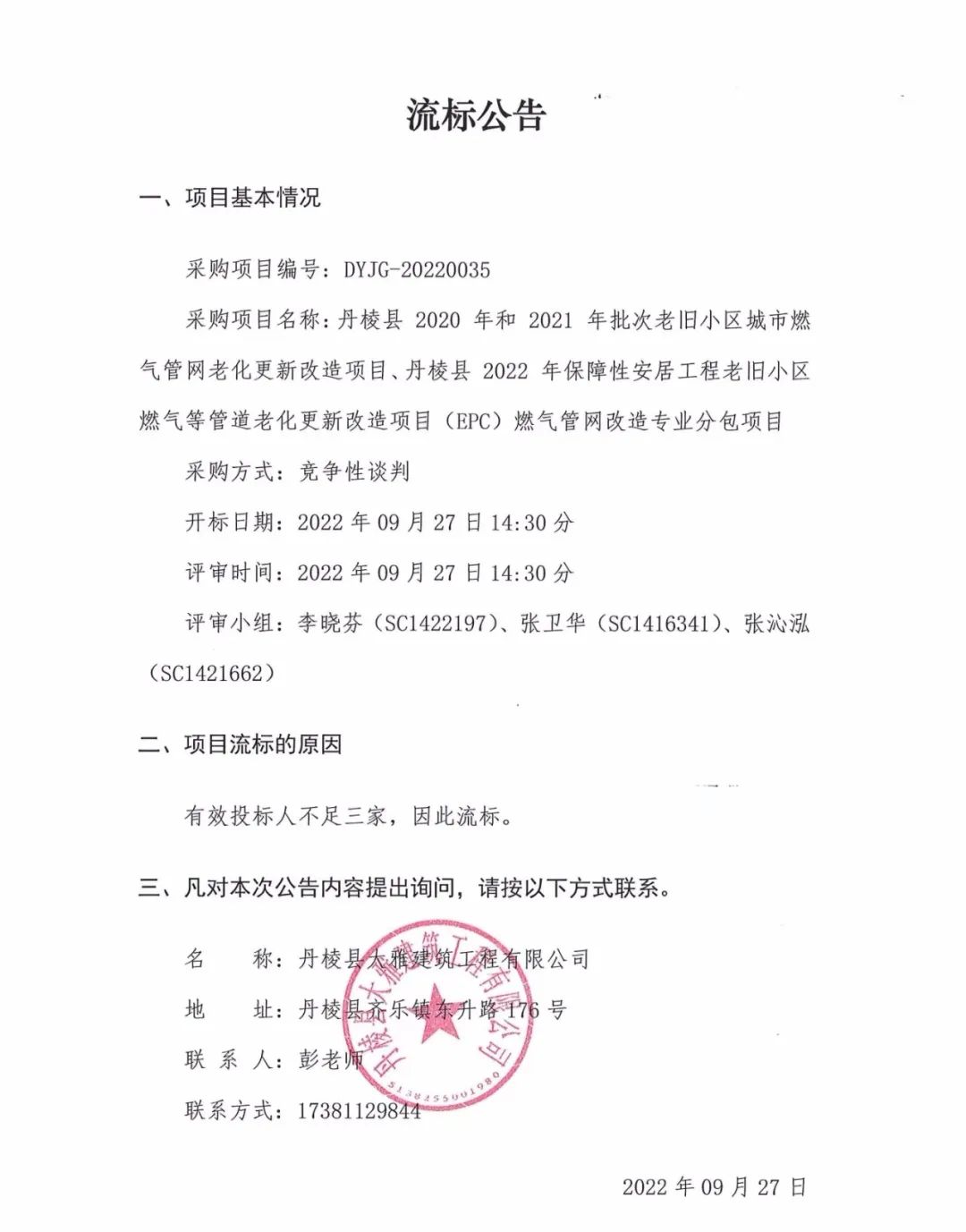 丹棱縣 2020 年、2021年及2022年批次老舊小區(qū)城市燃?xì)夤芫W(wǎng)老化更新改造項目燃?xì)夤芫W(wǎng)改造專業(yè)分包項目流標(biāo)公告