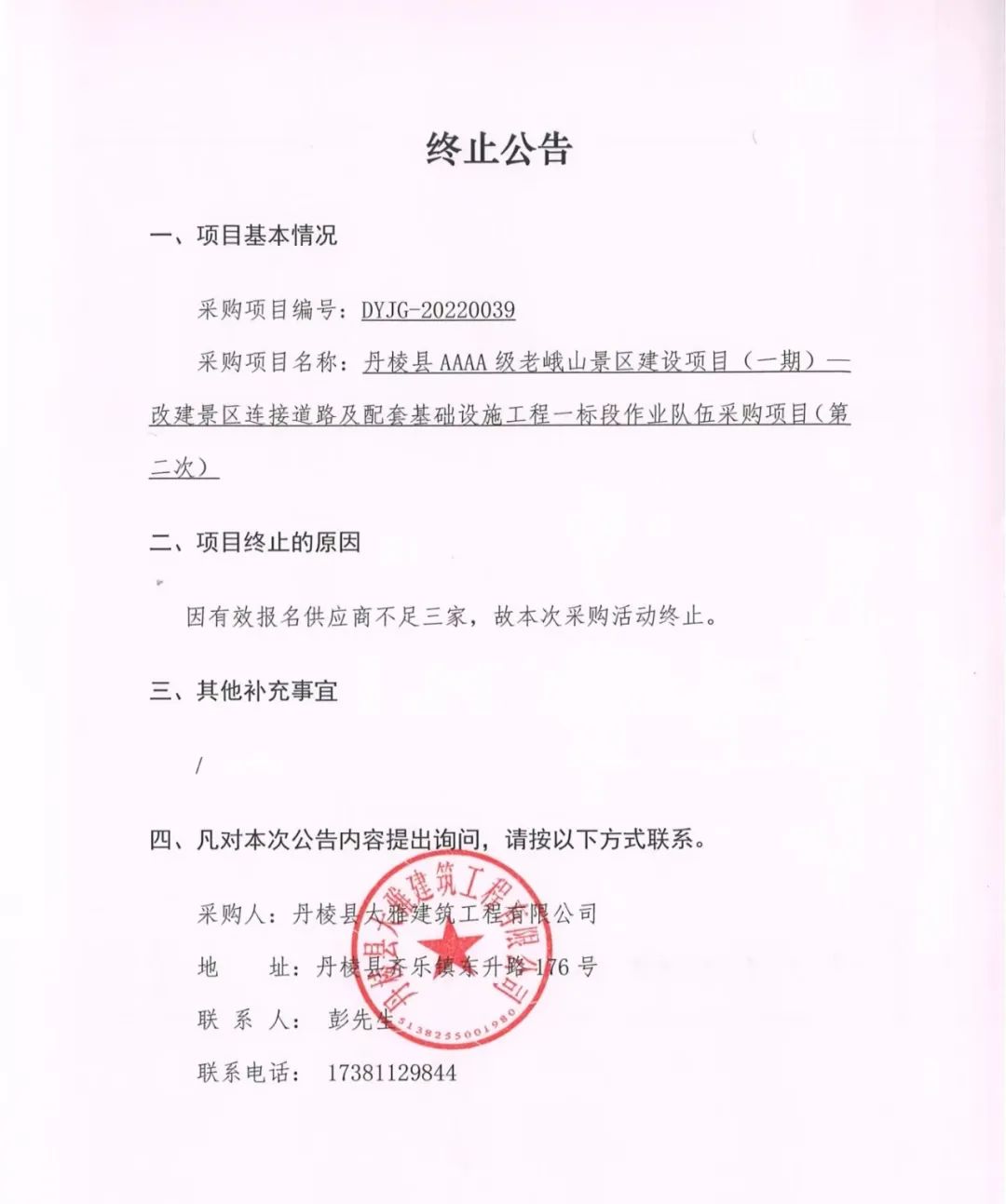 丹棱縣AAAA級(jí)老峨山景區(qū)建設(shè)項(xiàng)目(一期)--改建景區(qū)連接道路及配套基礎(chǔ)設(shè)施工程一標(biāo)段作業(yè)隊(duì)伍采購項(xiàng)目(第二次)終止公告