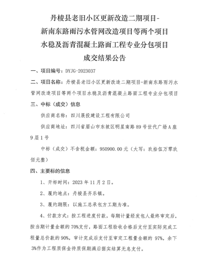 丹棱縣老舊小區(qū)更新改造二期項目-新南東路雨污水管網(wǎng)改造項目等兩個項目水穩(wěn)及瀝青混凝土路面工程專業(yè)分包項目成交結(jié)果公告
