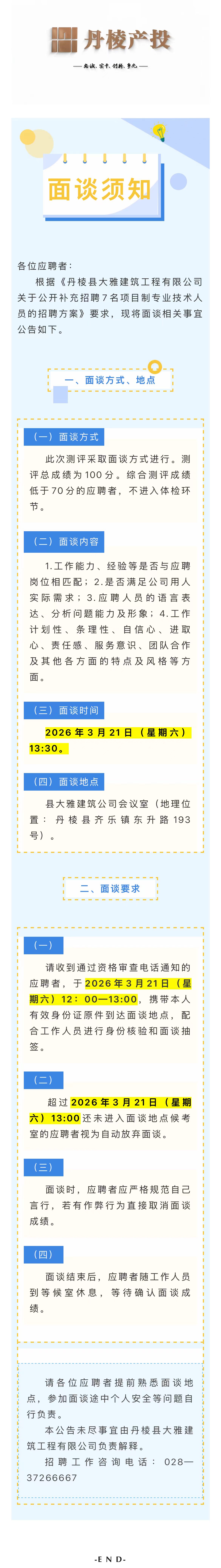 丹棱縣大雅建筑工程有限公司關于公開補充招聘7名項目制專業(yè)技術人員的面談須知