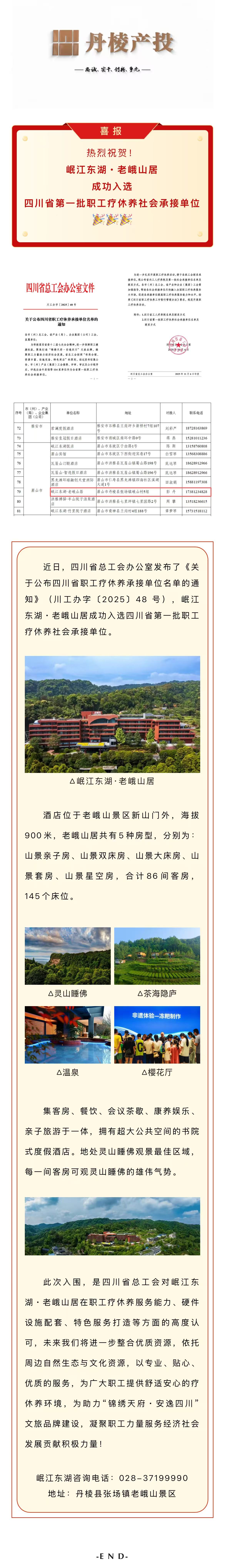 【縣文旅公司】喜報!岷江東湖・老峨山居入選四川省第一批職工療休養(yǎng)社會承接單位名單!