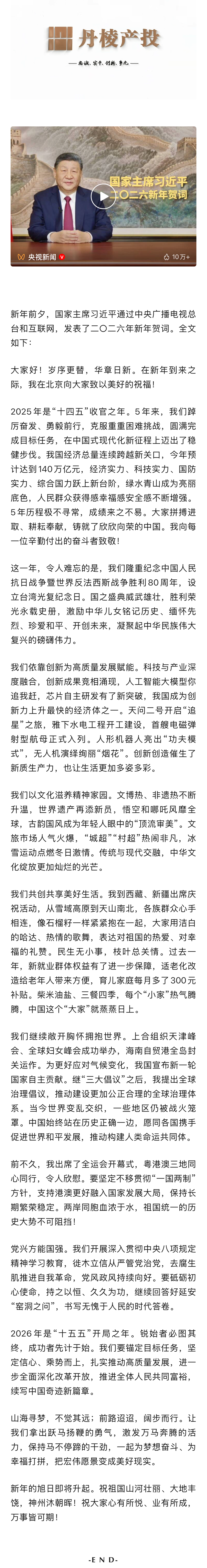獨家視頻 | 國家主席習(xí)近平發(fā)表二〇二六年新年賀詞