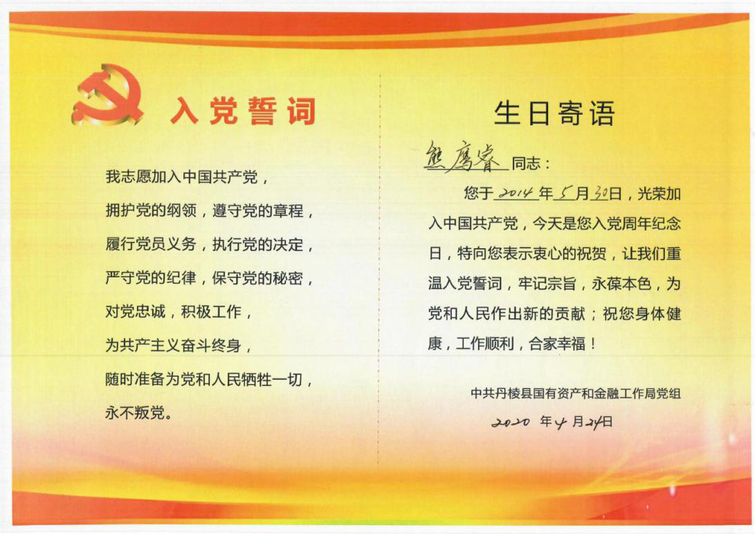 工作安排后,縣國資金融局黨組集體為5月入黨黨員過政治生日,縣國資金融局(縣金融服務中心)副主任茍永慶同志為“過生日”的黨員們送上精心制作的“黨員政治生日卡”,勉勵黨員同志要“常思入黨初衷、銘記入黨誓詞、牢記黨員義務”,發(fā)揮黨員先鋒模范作用,在今后的工作中不斷創(chuàng)先爭優(yōu),做好表率。活動最后,全體黨員同志在縣國資金融局黨組成員、副局長潘國榮同志的帶領下重溫入黨誓詞、面對黨旗莊嚴宣誓。
