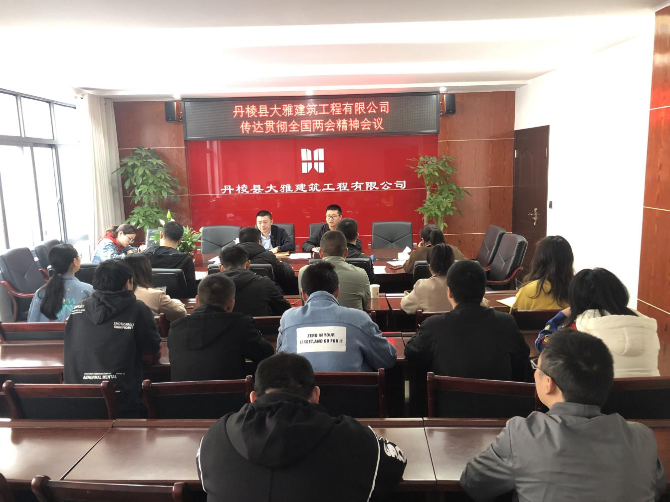近日,丹棱縣大雅建筑工程有限公司召開傳達貫徹全國兩會精神會議,公司董事長主持會議,全體黨員和干部職工參加。